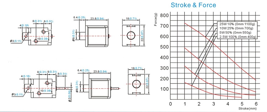 上圖所述分別是電磁鐵拉式圖紙和推式電磁鐵圖紙,右邊描述的是電磁鐵行程和力量的曲線圖;